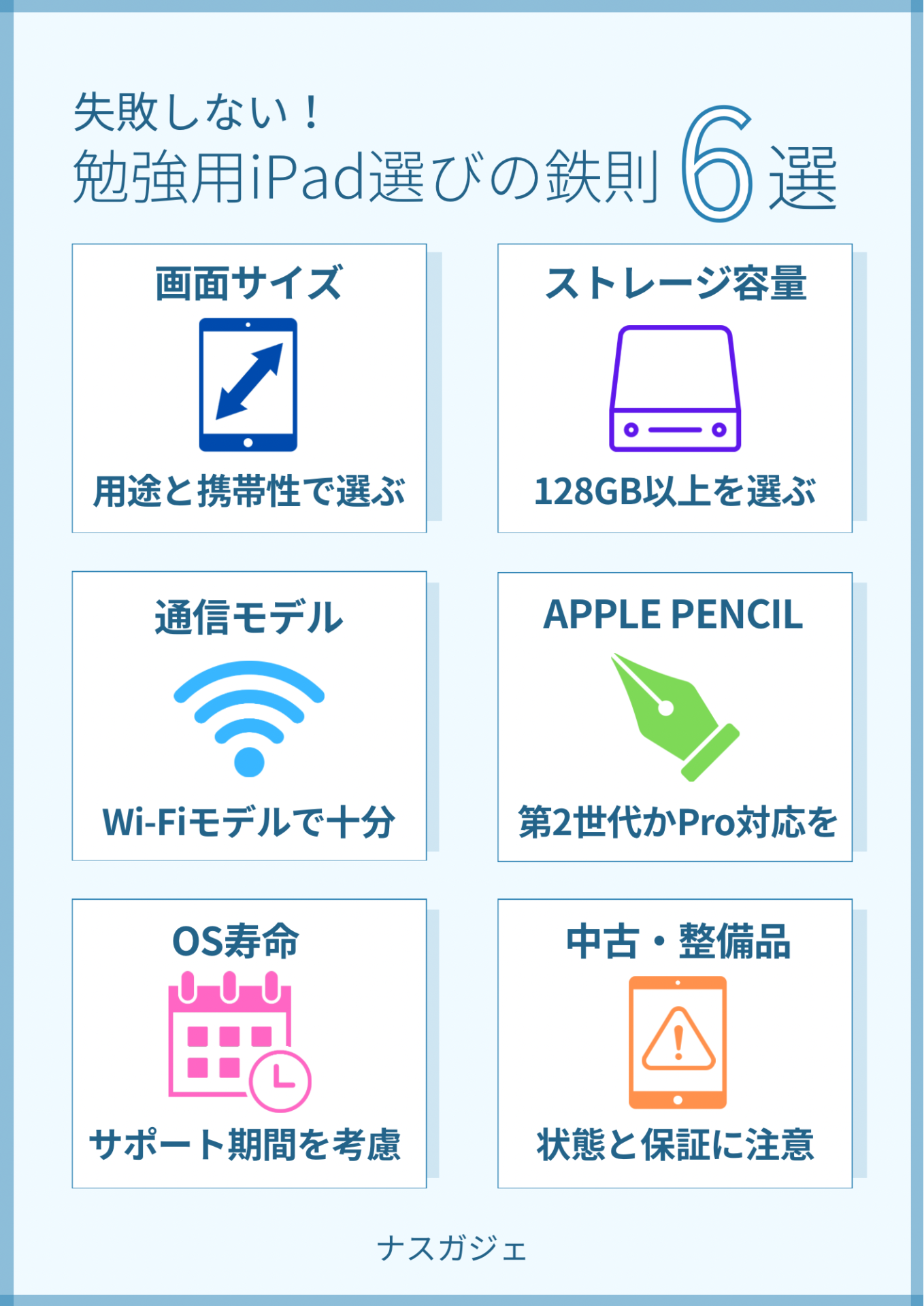 実は、勉強用のiPad選びなら押さえるべきポイントはたったの6つだけ。この基準さえ知っていれば、数ある選択肢の中からあなたにとっての「最適解」を簡単に見つけ出すことができます。