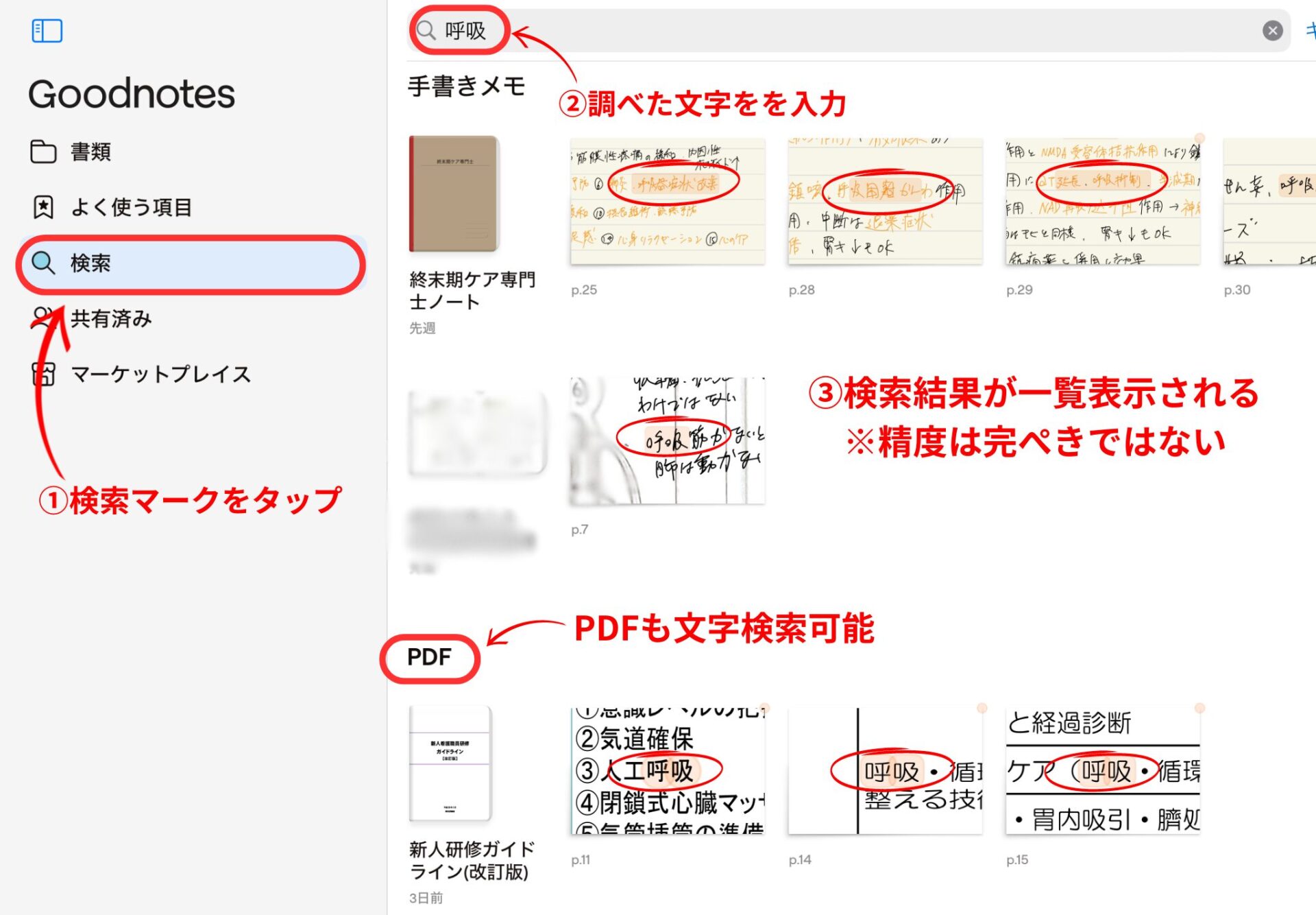Goodnotesであれば、検索バーにキーワードを入力するだけで、膨大なノートやDF資料の中から、該当箇所を瞬時にハイライト表示してくれます。