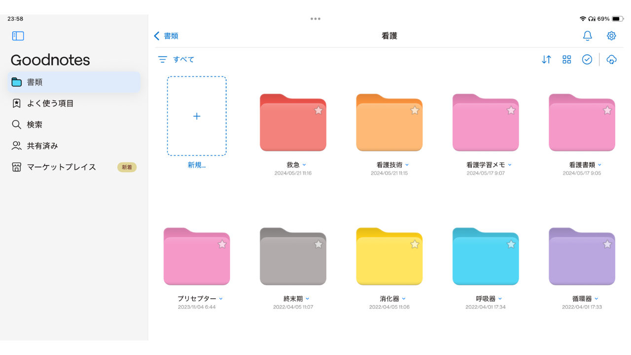 Goodnotesはを使えば、アプリ内にページ制限のないノートを無限に作成・保存が可能。科目や実習、国試対策といったカテゴリーで仕分けすることで、ノートの管理がしやすくなります。